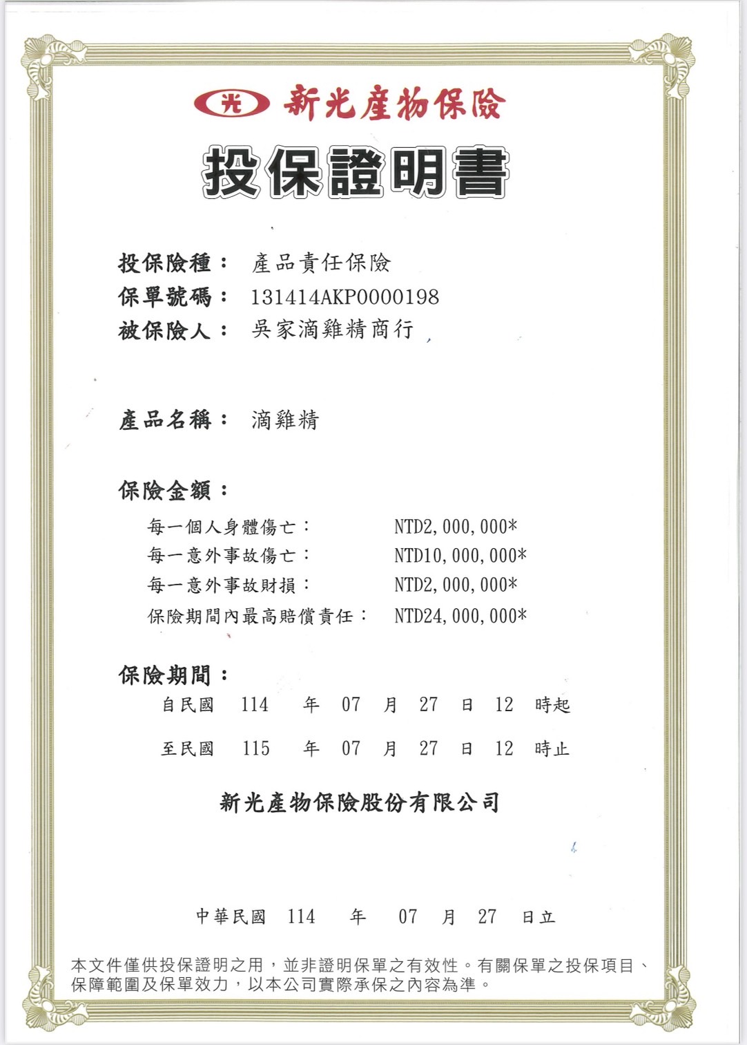 品牌服務 吳爸爸/吳媽媽所經營超過40年,販賣活禽生鮮雞肉攤轉型為「吳家滴雞精」,目前位於彰化社頭鄉零售消費市場營業。 大火提煉超過10個小時 吳家滴雞精,我們的作法,真的跟別人不同,現剁肉現滴製。 Facebook 滴雞精新鮮喝得出來 新鮮的食材,是讓你看的到, 喝的出真材實料。 7-11 送禮自用首選 真材實料的味道,農、純、香~ 年節婆婆媽媽的最愛 蝦皮購物 吳家滴雞精商行 商品通過SGS 48種動物用藥 抗生素檢測 生菌數及大腸桿菌均未檢出 定期幾隻藥檢合格證明 屠宰證明 產品無添加任何添加物 新光產品責任險 客戶真心推薦 更多推薦